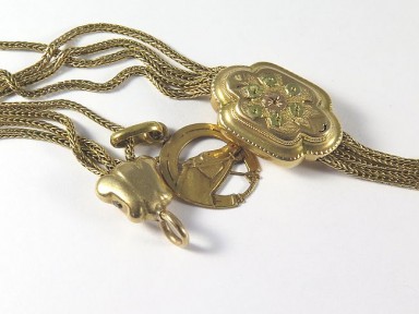 with two three-colour gold slides, horseshoe charm and gold-plated swivel. Wt 14.9g. -