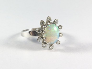 oval cabochon white crystal opal (10 x 7.6mm) multi-claw-set within ten single cut diamonds; 18ct white gold. Wt 4.5g. -