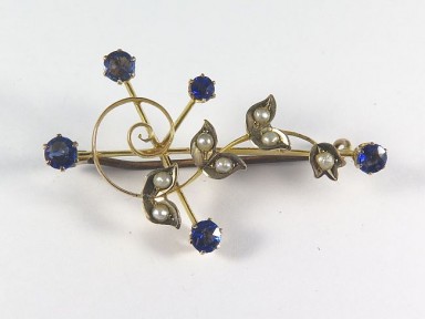 set with blue doublets and seed pearls; Willis & Son; metal pin. Width 41mm. -