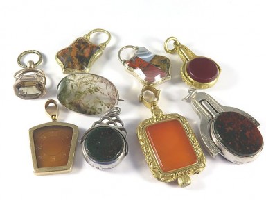 silver and agate brooch, a gold and smoky quartz fob seal, a 9ct gold and agate Masonic pendant, swivels, key etc. (silver, gold and gilt metal). (9) -