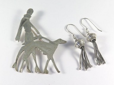 an Art Deco brooch 'Lady and Borzois' and a pair of tassel drop earrings with hook fittings. (2) -