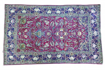wool and silk on cotton, the field finely knotted with scrolling tendrils and florals including pairs of herons, hawks and peacocks, rich tones of claret, indigo and turquoise dominate, the border guard with floral panelled decoration. The silk ivory florals with coloured highlights. 2150 x 1300. -