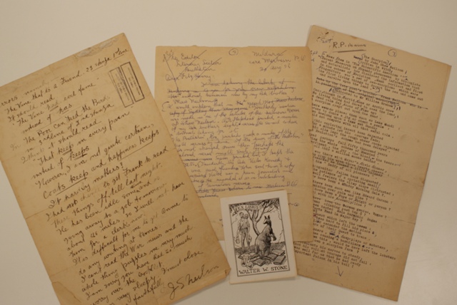 Three Manuscript Letters by John Shaw Neilson and Related Items. including a one page manuscript letter, with text on both sides, dated 27 September 1938 and dictated by Nielson to his brother, Frank. Nielson's correspondant is his friend and biographer, James Devaney, who helped him with what was to be his final publication, 'Beauty Imposes', of 1938. Nielson suggests changes to 'The Vine that is a Friend' and 'The Poor Can Feed the Birds' from that collection. He goes on to apologise that Devaney 'has had so much worry over the booklet' and further laments that his brother is due to go away the next day 'so I wil not have him for a clerk now,' a concern given Nielson's poor eyesight. Two other letters concern more mundane matters, such as Nielson's quarterly dues to the Bread and Cheese Club (dated 20 February 1940) and the Education Gazette (dated 4 January 1928). All of the above are marked with Walter Stone's stamp. Also included is a draft of a letter from Frank Nielson to Bill FitzHenry of The Bulletin, dated 30 August 1956, suggesting that he consider a previously unpublished example of his brother's light verse, the manuscript of whch was in Frank Neilson's possession. One can only assume that the verse was 'The Scorpion', of 1938 a corrected typewritten proof of which is included in this lot. Also including Raymond Lindsay's book plate for Walter Stone. Provenance: Walter Stone Collection (catalogue 5), The Antique Bookshop & Curios, Sydney, 1985, lot 3134a (part), p. 312 (illustrated) Private Collection, Sydney -