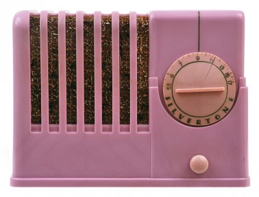 American, circa 1936, lavender plaskon case and knobs, cracked dial 15cm high x 25cm wide x 14cm deep -