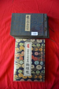 each tipped in with a page of accompanying text in Japanese characters, cloth bound with calligraphy detail to cover, measures 15 x 23cm, also comes later Japanese art book with calligraphy details to pages, possibly used for drawing or practising calligraphy etc, concertina fold style, modern example -