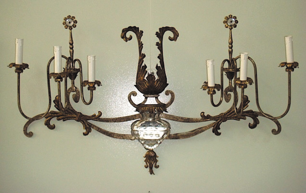 Lot Description:A single “Bagues”-style horizontal gilt iron and cut crystal wall sconce