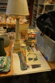 signed & dated '95 plus an antique camelia lithograph, a painted timber table lamp, crystal bowl, Doulton plate etc -