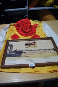 together with a finish line photo of a horse 'Candida' showing the same silks as worn by the winning jockey -