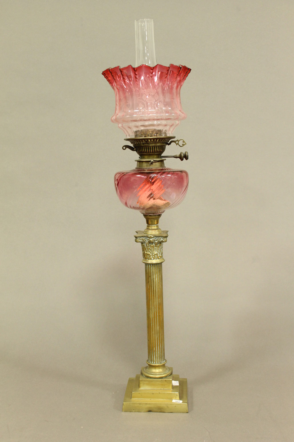 on brass corinthian pillar base with cranberry resevoir and shade clear funnel.