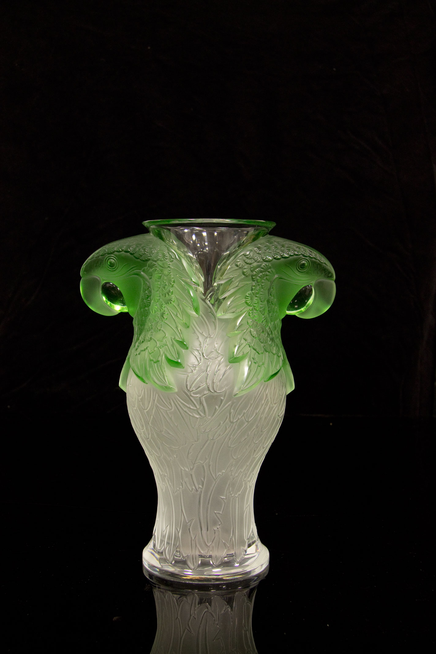 with two juxtaposed cockatoo heads in green with relief frosted satin finish feather bodies signed ed. 71/99. Small fault.