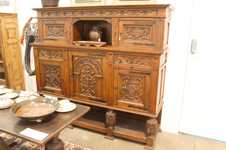 in the Jacobean style with extensive carving and decorative ironwork. The whole raised on a platform base with turned and carved supports.