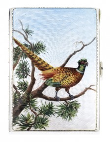 The rectangular case with hand painted pheasant on guilloche enamel and engine turned detail, in sterling silver. -