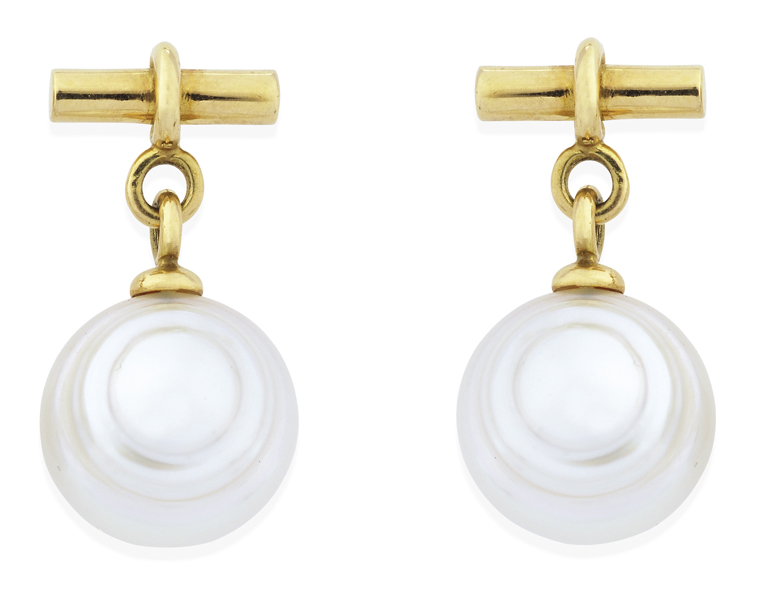Each earring comprising a button shaped pearl of silver white hues, measuring 12.7mm suspended below a t-bar, to post and butterfly fittings in 18ct gold, with box and papers. -