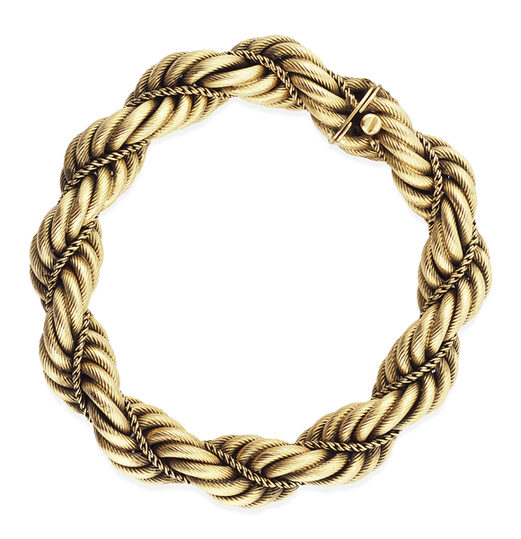 The heavy rope twist design in 18ct gold, total weight 52.09gms, total length 215mm. -