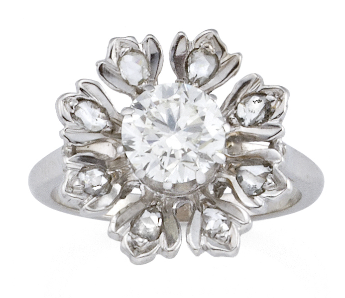 Of floral design, centrally set with a round brilliant cut diamond weighing 1.15cts, within stylized petals, each set with a rose cut diamond, in rhodium plated 18ct yellow gold, ring size L-M. -