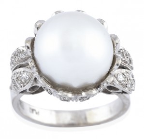The round pearl of silver white hues measuring 13.9mm, centred within a scalloped diamond set surround, and scrolled diamond set shoulders, in 18ct white gold and platinum, ring size P-Q. -