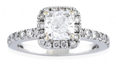 Centrally set with a cushion cut diamond weighing 1.20cts with GIA laser inscribed girdle, surrounded by a border of round brilliant cut diamonds, in 18ct white gold, GIA certificate and independent valuation available, ring size K-L. -