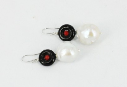 the baroque pearl drops surmounted by onyx and coral beads, on 9 carat hooks. Length pearls 2.3cm. -