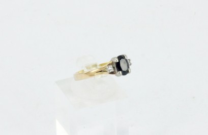 oval cluster sapphire, surrounded by two brilliants, set in 18 carat gold. Ring Size M. Total weight 3.2g. -