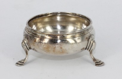 raised on tripod legs, English silver, mark indistinct. Diameter 5.5cm. Weight 37.4g. -