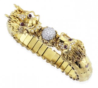 Featuring finely detailed Chinese dragons set with round brilliant cut diamonds and ruby eyes, to an articulated bracelet in textured and polished finish, in 14ct gold, total length 180mm. -