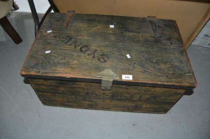 metal fittings, hinged lid, iron & brass, stencilled Sydney etc -