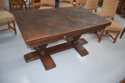 Lot Description:Old solid oak parquetry topped drawer leaf table
