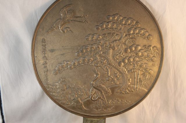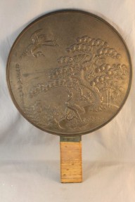 of circular form, decorated with storks in flight amongst fern tree, with characters to the side, the handle of rectangular form, with bamboo stringing -