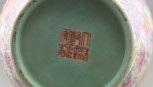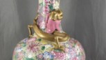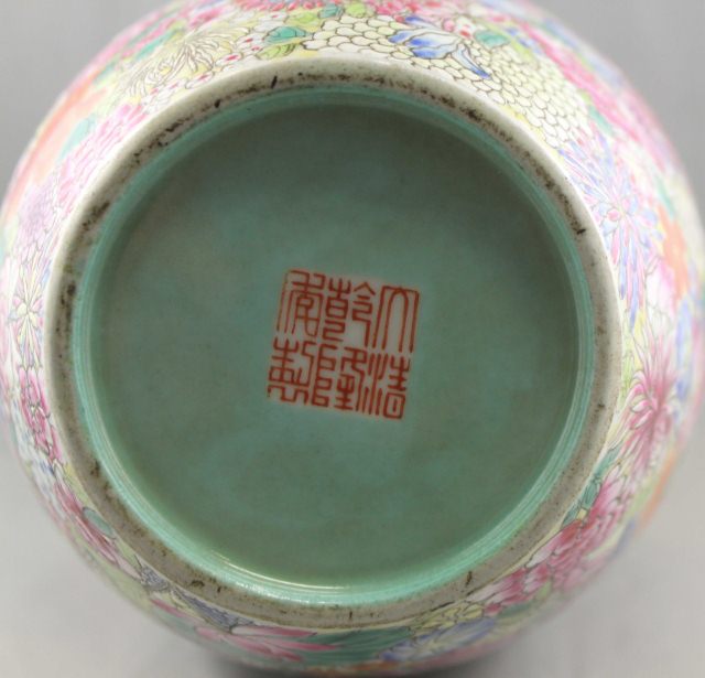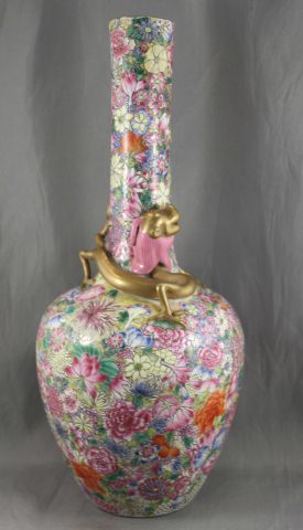 of mallet form, enameled with thousand flower motif, in bright tones of pink, green, yellow and orange, accented with applied gilt dragon to neck, seal mark to base, h 32cm -