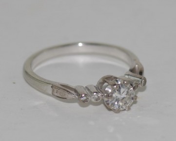 with a brilliant cut centre stone, supported with 8 prongs, two rubbed over set small diamonds to each shoulder. Size 6/L-M, total weight 2.4gms. -