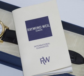 with white face, Roman numerals and date aperture at 3, inscribed: Raymond Weil, Geneva, the reverse numbered 5567/Z524843. In original box, with leather strap. -