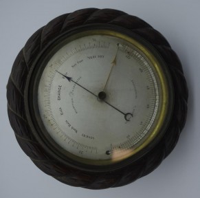 and thermometer set, with carved wood mounted brass case, 16.5cm diameter -