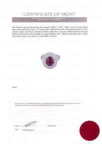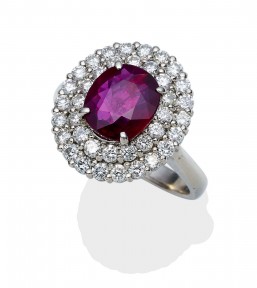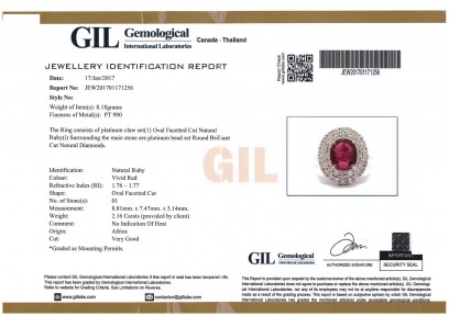 of cluster design. The central oval ruby of known weight 2.16 carats, surrounded by a double row of brilliant cut diamonds. Known diamond weight 1 carat. Platinum. Weight 8.1 grams. Size M. Accompanied by a GIL Identification Report No. JEW201701171256 dated 17/01/17, stating natural ruby, origin Africa, no indication of heat treatment identified. -