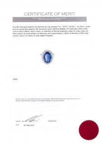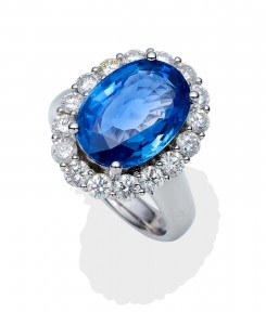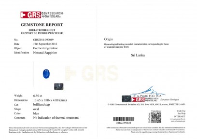 the central oval sapphire of known weight 6.50 carats surrounded by sixteen brilliant diamonds of known total weight 1.42 carats. 18ct white gold. Weight 8 grams. Size N. Accompanied by GRS Gemstone Report No GRS2016-099049 dated 19/09/16, stating natural blue sapphire, origin Sri Lanka, no evidence of heat treatment identified. -