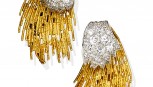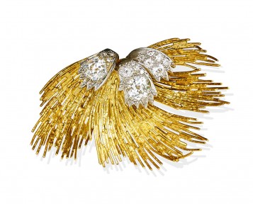 Comprising brooch and earrings, of textured abstract design, each with white gold pave diamond set panels. Estimated total diamond weight 4.3 carats.18ct yellow gold. Weight 32 grams. Length of brooch 5.5cm. Clip attachments. Signed HJCo, London hallmarks. -