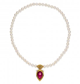 Lot Description:A tourmaline, diamond and pearl necklace, Russell Brooks, Maker’s Mark