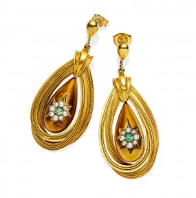 Lot Description:A pair of Victorian gold, emerald and seed pearl drop earrings