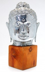 Lot Description:A Thai Buddha Head on Wood Stand, Silver Painted