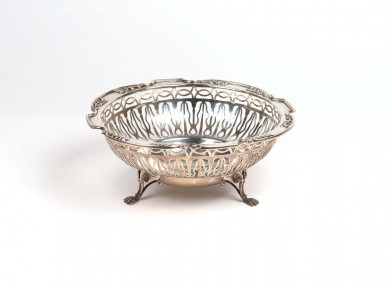 Lot Description:A George V sterling silver pierced circular bowl on three winged lion paw feet by ES Barnsley & Co, Birmingham 1917