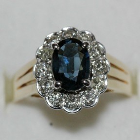 cluster dress ring, set with a central oval claw mounted sapphire, 8.5 x 5.5, along with 12 brilliant cut diamonds on a tapered yellow gold band, .35 pts approx., ring size P, weight 5.6 grams -