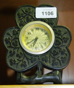 Lot Description:A vintage clock, cased in Irish bog oak, carved