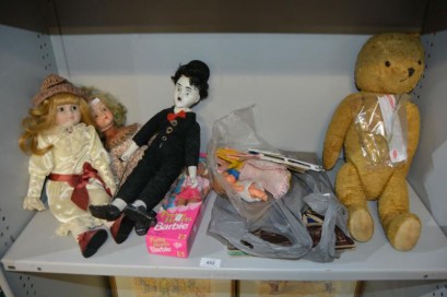 porcelain dolls incl. Charlie Chaplin, very early teddy bear, puzzles and miniature dolls -
