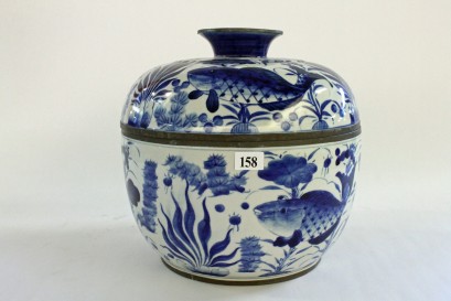 with six lucky gold fish and sea life design and brass fittings. Four characters to base. (a/f; hairline fracture to surface of glaze to lid 3 cm). Height 25 cm, diameter 26cm. -