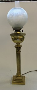with Victorian Oil lamp surmounted on a Corinthian column converted brass base. Electrified. Height 86.5cm -