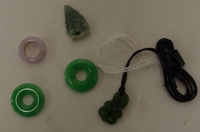 including greenstone amulet, & tiki; 2 greenstone discs; & 1 other disc. -