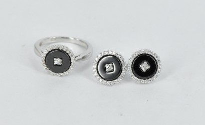 black enamel set with Cubic Zirconia. Together with a matching ring. Size N. Weight 8g. -