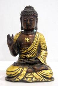 a fully round face in contemplation, a swastika in the centre of his chest representing his status in the afterlife,