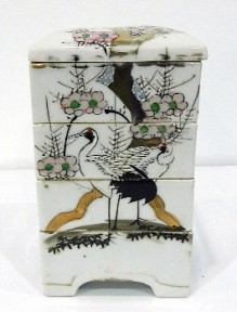 Lot Description:Japanese porcelain four-tiered stacking box, painted with a Red Crested Crane, mid 20th Century