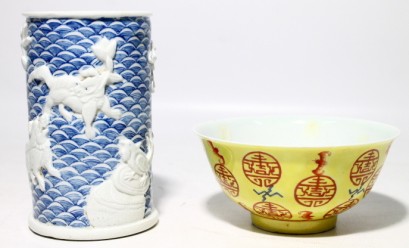 Lot Description:Chinese Porcelain Brush Pot & Yellow Glazed Bowl, each with a seal mark, Republic Period