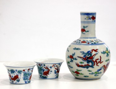 Lot Description:A Chinese Porcelain Bottle Shape Vessel & Two Cups, a Wucai Glaze a Chenghua Mark 1465-1487